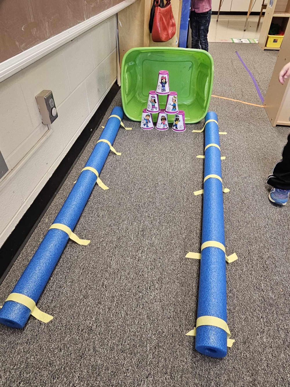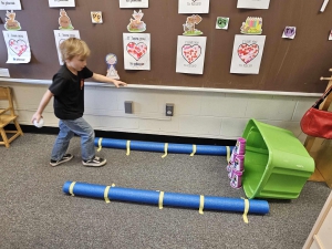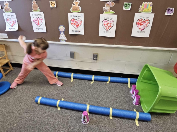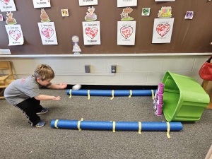 Wetzel County, WV - Our 3 year old preschoolers from the Short Line School classroom began the Creative Curriculum Ball Study this week, and added a bowling lane in our classroom! Miss Amanda shares the children take turns stacking the cups in a pyramid shape while counting and then throwing our snowball to knock them down. We then count how many cups we knocked down and do it again. The kids are being very patient while waiting their turns and cheering on their friends. The developmental approach to learning "score" here is a 300 for each child!