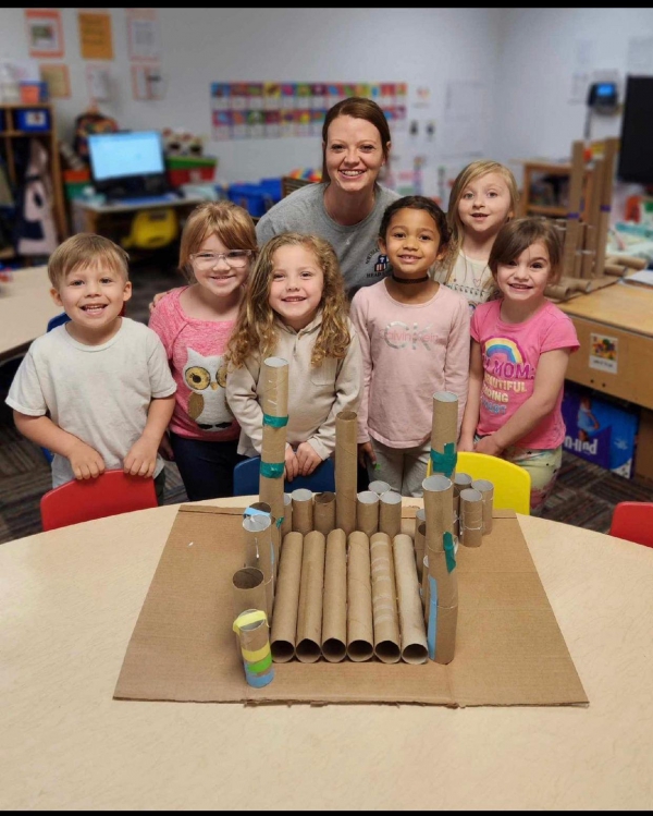 Ohio County, WV - The Orchard Park 1 Pre-K students are most recently engaged with the buildings study as part of Creative Curriculum. Ms. Becca and Ms. Maria handed the children "a lot" of cardboard rolls and watched them create their masterpieces. First, they split up into two groups, then each group voted on what they were going to build. After consensus was reached in each group, then they had to problem-solve to determine what type of 'construction' materials would hold their project together. They used teamwork, and worked extremely hard using glue and tape. Those children at Ms. Becca's table made a Castle, and at Ms. Maria's table made Disney. The finished products are now on display in the front lobby. Ohio County Schools