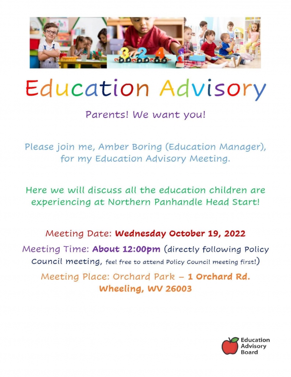 Join Our Education Advisory Committee - Help us to impact the early childhood learning experiences for young children. See the details here. Contact Amber Boring, Education Manager, aboring@npheadstart.org or call 304.233.3290.