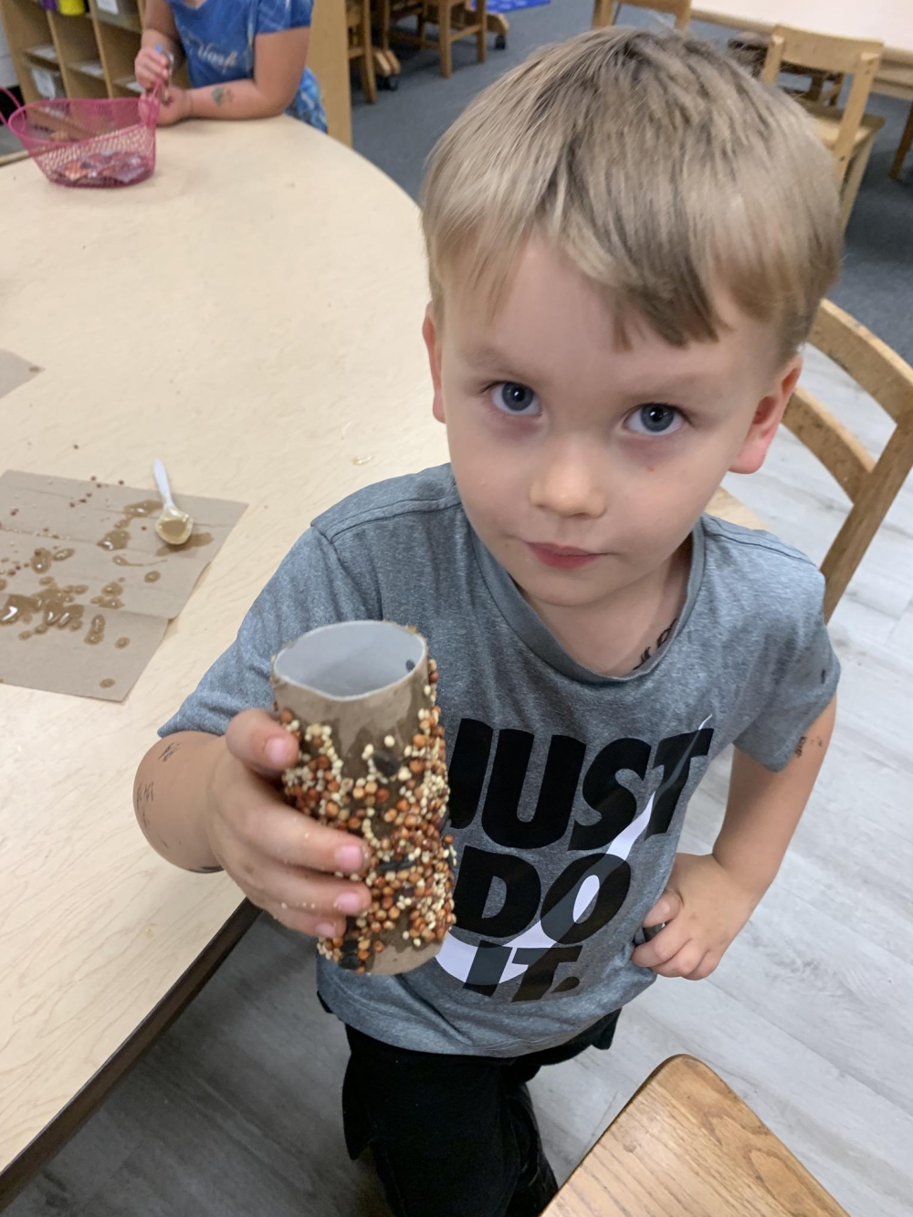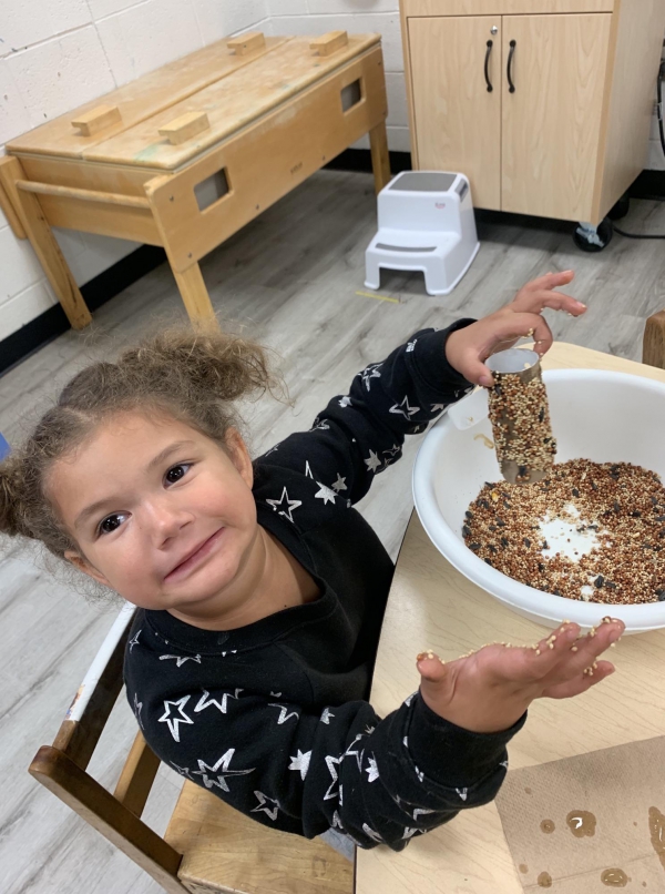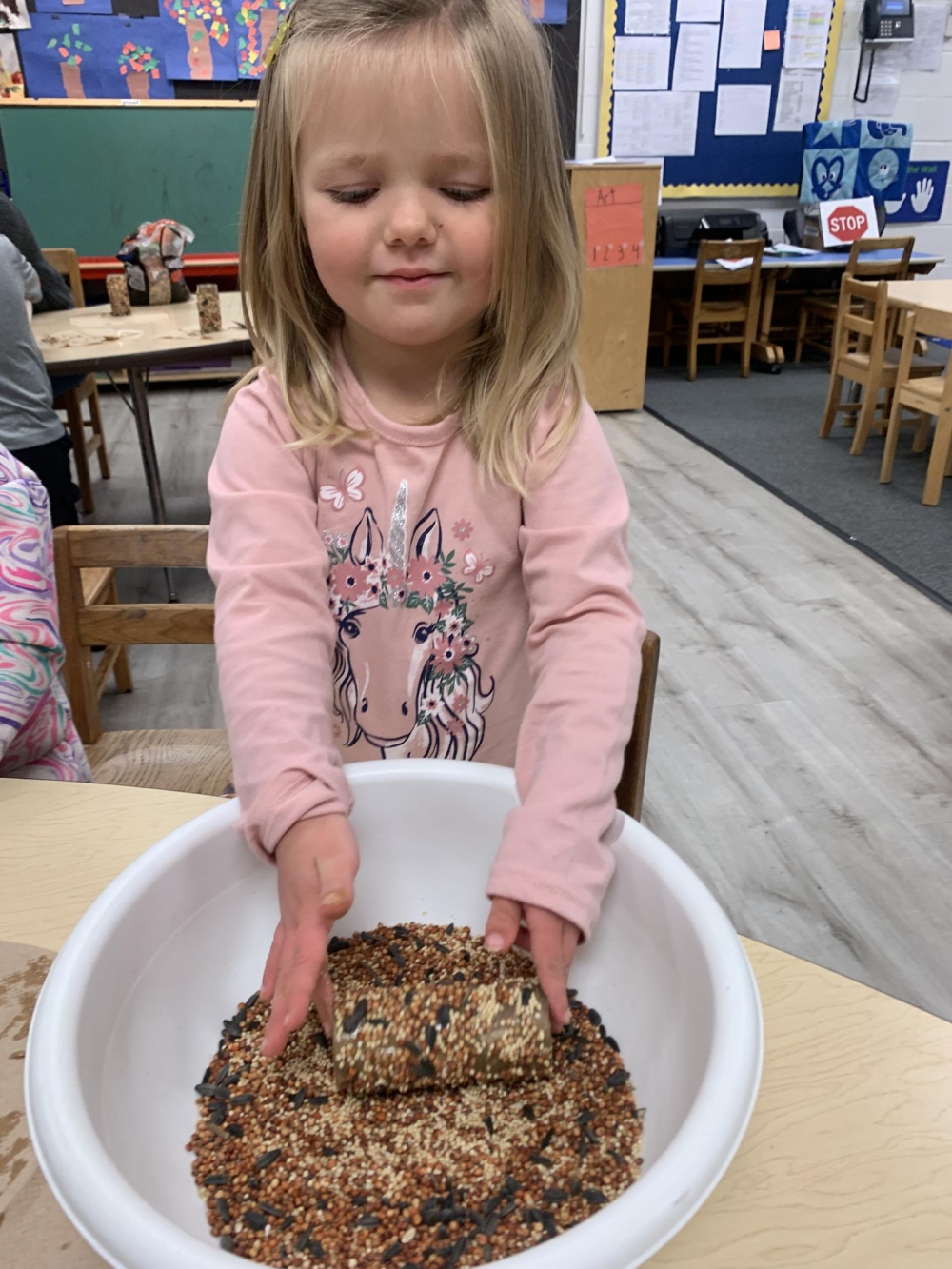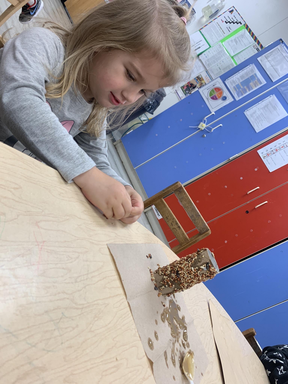 Students made predictions as to how we were going to get the bird seed to stick. “Glue” was an answer one student gave. “Yes, glue would make it stick!...Can birds eat glue?” She replies, “No.” “ Why not?” “It could make them sick.” After some brainstorming we concluded sun butter would be safe to use in the classroom and for the birds. Each student took home their bird feeder to hang outside at home. We will be hanging our bird feeder outside the classroom to see if birds visit the feeder. As we continue our tree study, we are learning about what creatures live in trees, how trees change over time, and what trees are often used for.