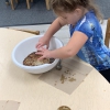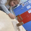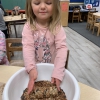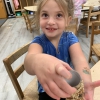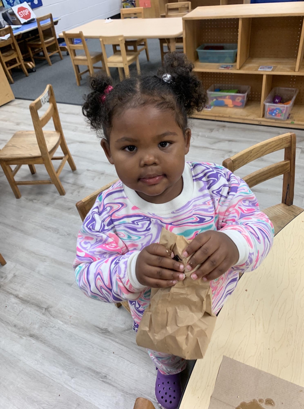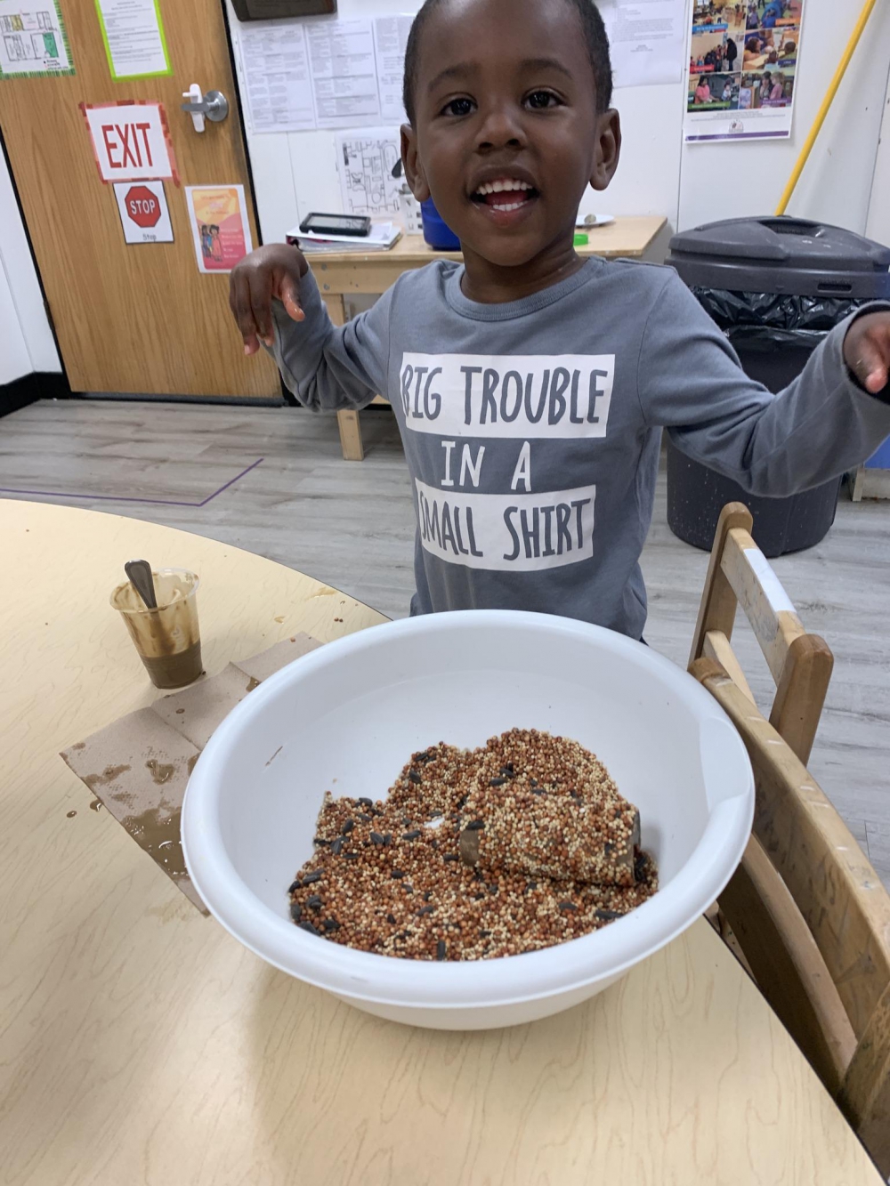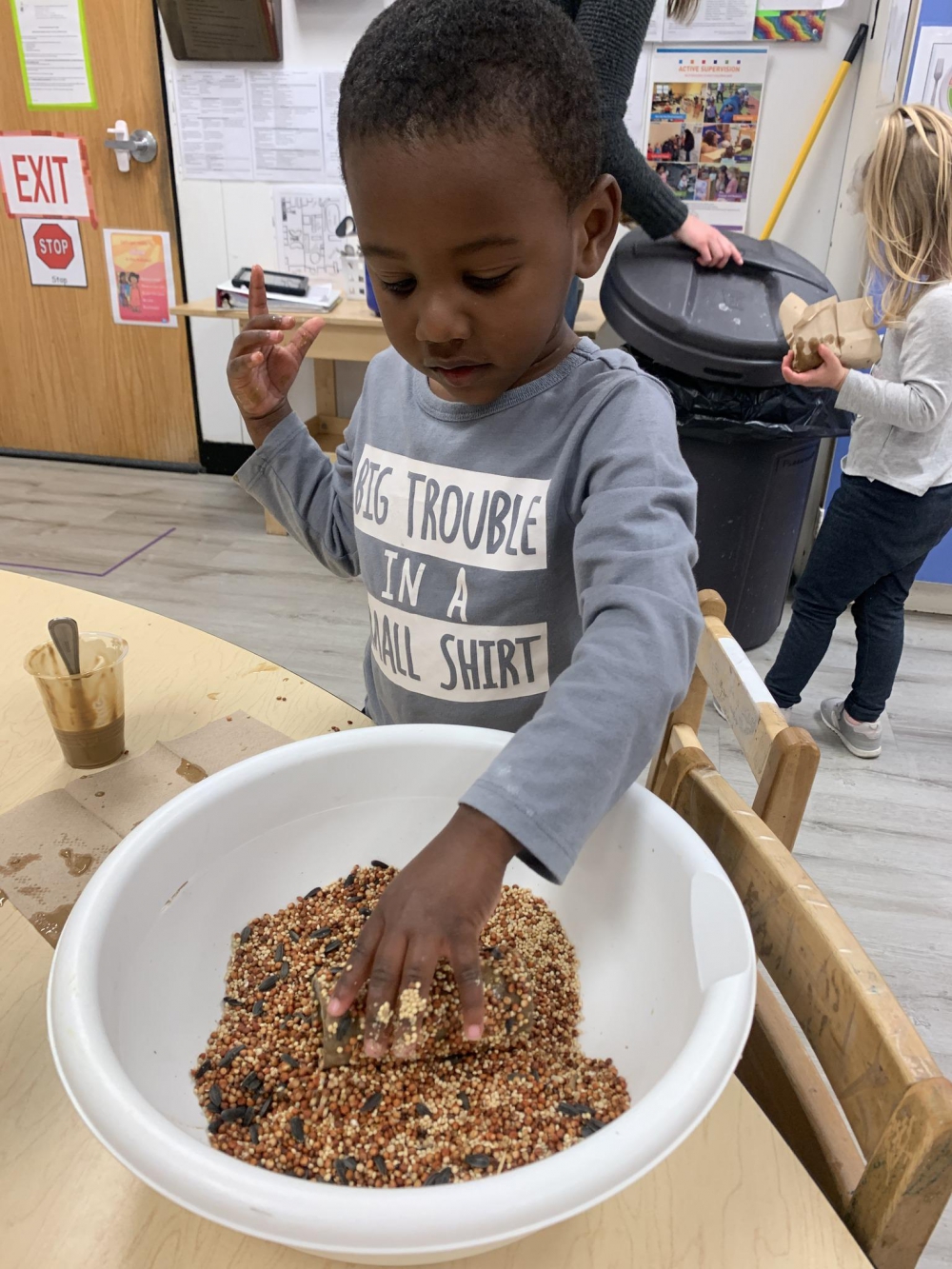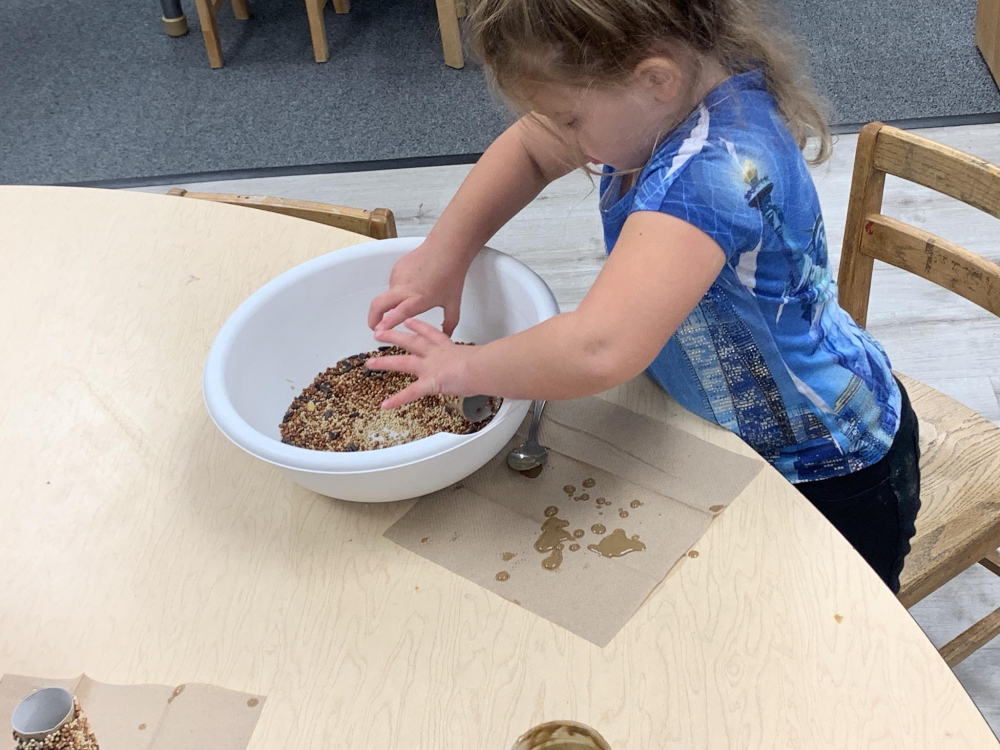 Students made predictions as to how we were going to get the bird seed to stick. “Glue” was an answer one student gave. “Yes, glue would make it stick!...Can birds eat glue?” She replies, “No.” “ Why not?” “It could make them sick.” After some brainstorming we concluded sun butter would be safe to use in the classroom and for the birds. Each student took home their bird feeder to hang outside at home. We will be hanging our bird feeder outside the classroom to see if birds visit the feeder. As we continue our tree study, we are learning about what creatures live in trees, how trees change over time, and what trees are often used for.